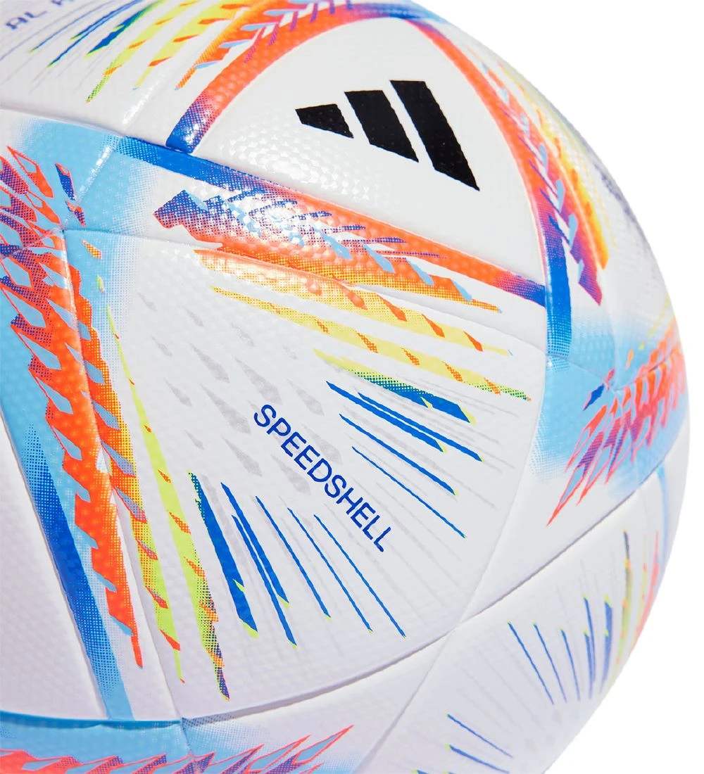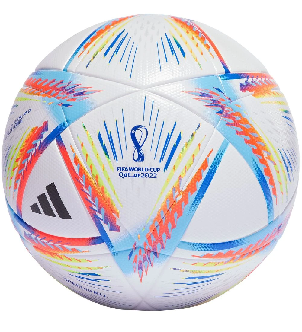 Smart adidas Performance fodbold i hvid med et allover mønster i blå, rød og gu. Bolden har adidas Performance-logoprints samt “Fifa World Cup” og “Al Rihla” skrevet rundt på bolden.