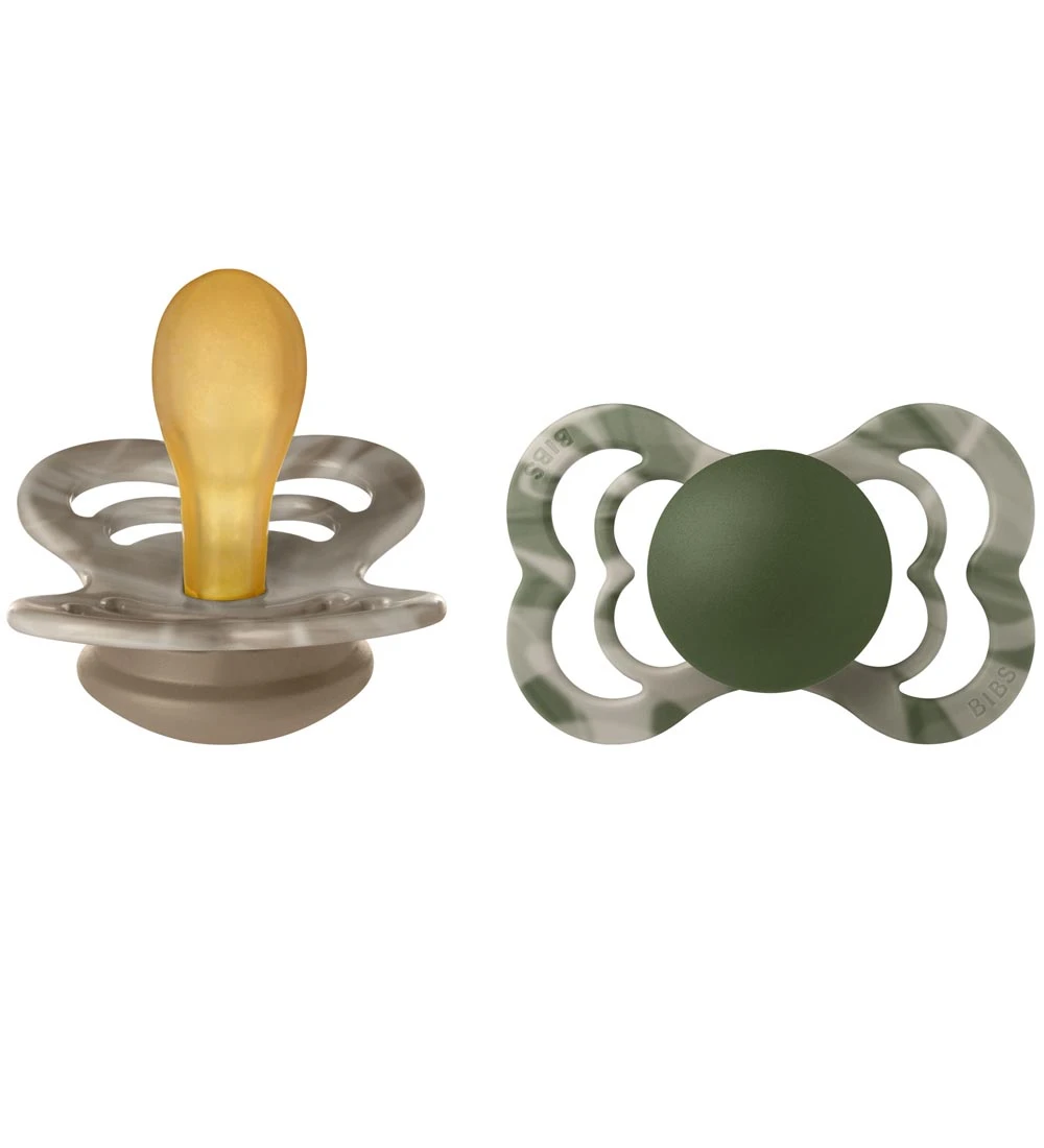 Pæne Bibs sutter solgt i en 2-pak i brun og grøn med tie dye-mønster.