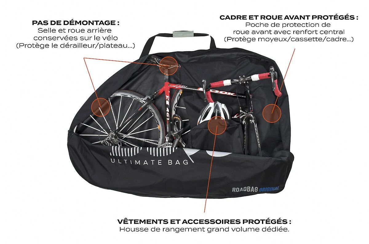 The extremely practical RoadBag Original transport bag from BUDS stands out for its ability to transport a complete bike without having to dismantle the rear wheel or lower the seat post. Simply remove the front wheel and slide it into the protective bag.