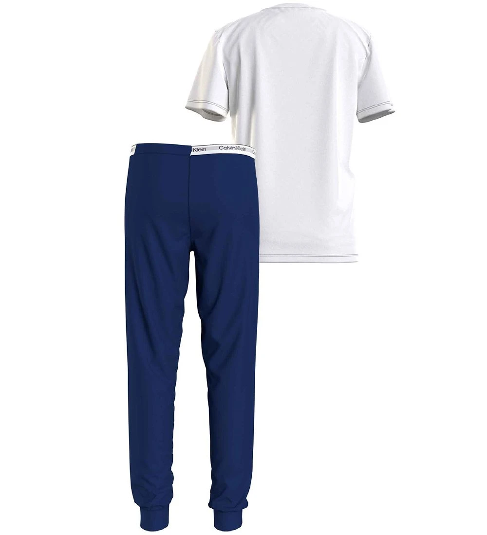 Calvin Klein t-shirten har korte ærmer og en rund halsudskæring. I alle åbninger er der smalle ribkanter. Bukserne har en god elastikkant i taljen, som sikrer en god pasform og i benåbningerne er der brede ribkanter.