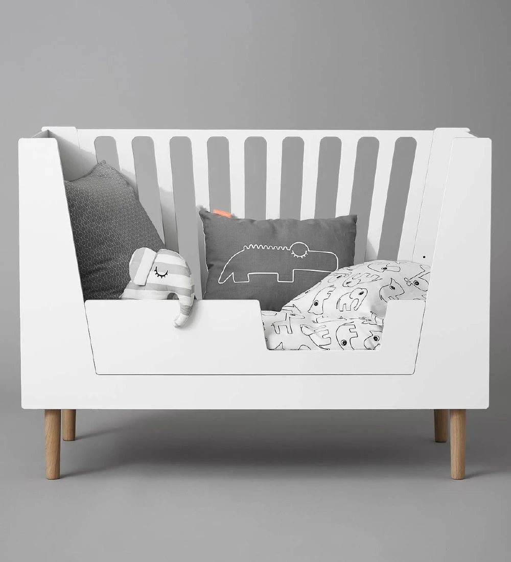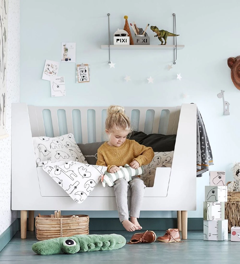 Done By Deer sengehesten sættes på den ene langside af tremmesengen der måler 60×120 cm. Den høje kant sørger for at barnet ikke falder ud af sengen om natten.