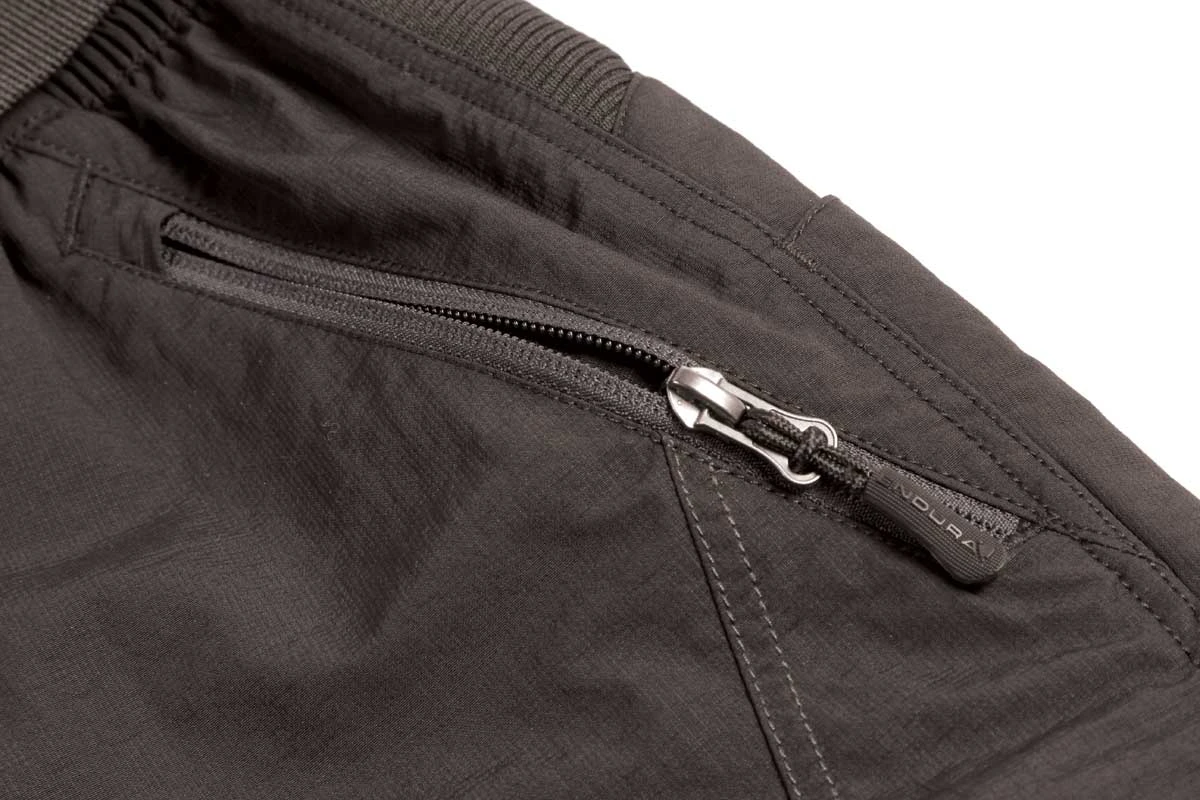 I siderne er der lommer med lynlås og i livet er der elastik og bælte.