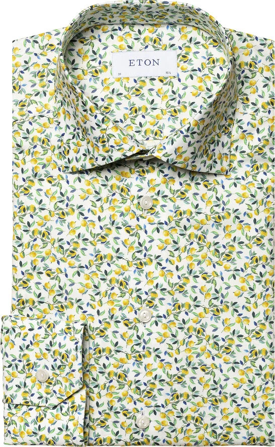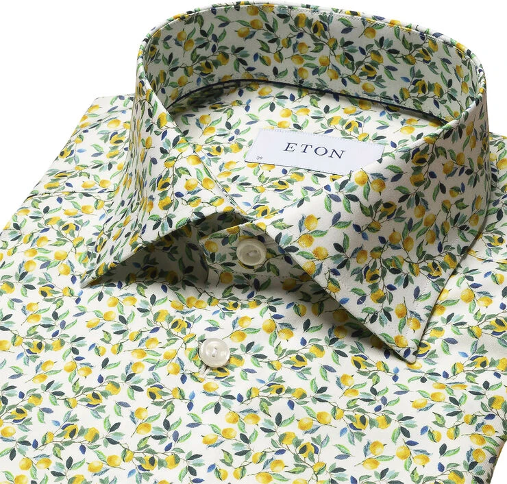 A playful lemon print, inspired by the Sardinian lemon trees. Printed on Eton’s popular Signature Twill and rich in detail, this is an ideal choice for a summer party or for spring business. Also available as contrast.