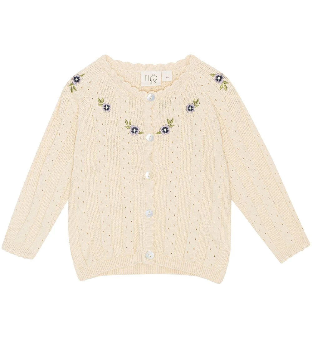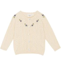 Skøn Flöss cardigan i en strikket kvalitet i beige med broderede blomster fortil i blå, lilla og grønne nuancer. Cardiganen har en stribet struktur samt et dekorativt hulmønster.