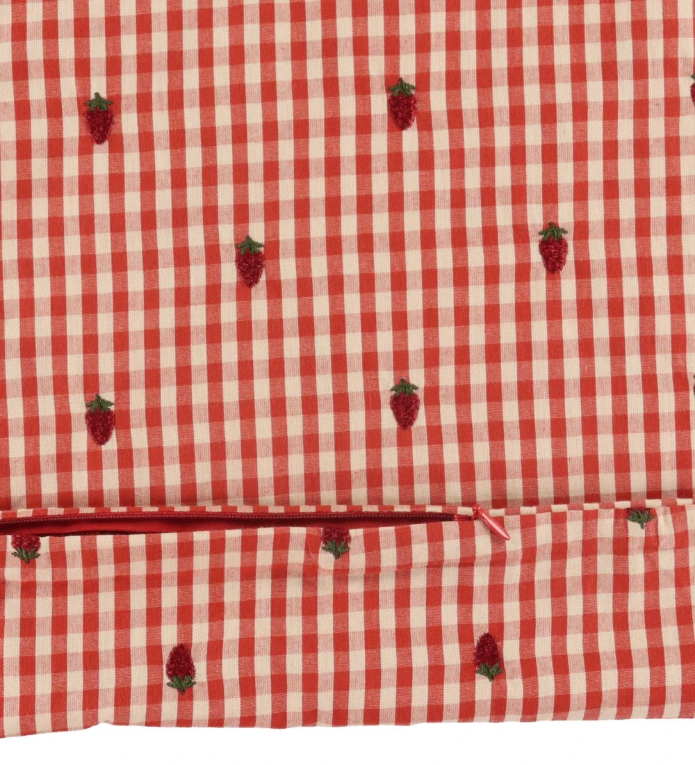 Lækkert Flöss sengetøj med røde og beige tern med små, broderet jordbær.