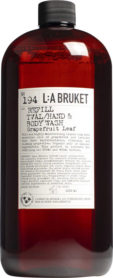 Mild and highly moisturising liquid soap with essential oils of grapefruit and lavender that have bacteriostatic, cleansing and calming properties. Organic and/ or natural ingredients. This product is intended for refilling our 250ml and 450ml bottles.