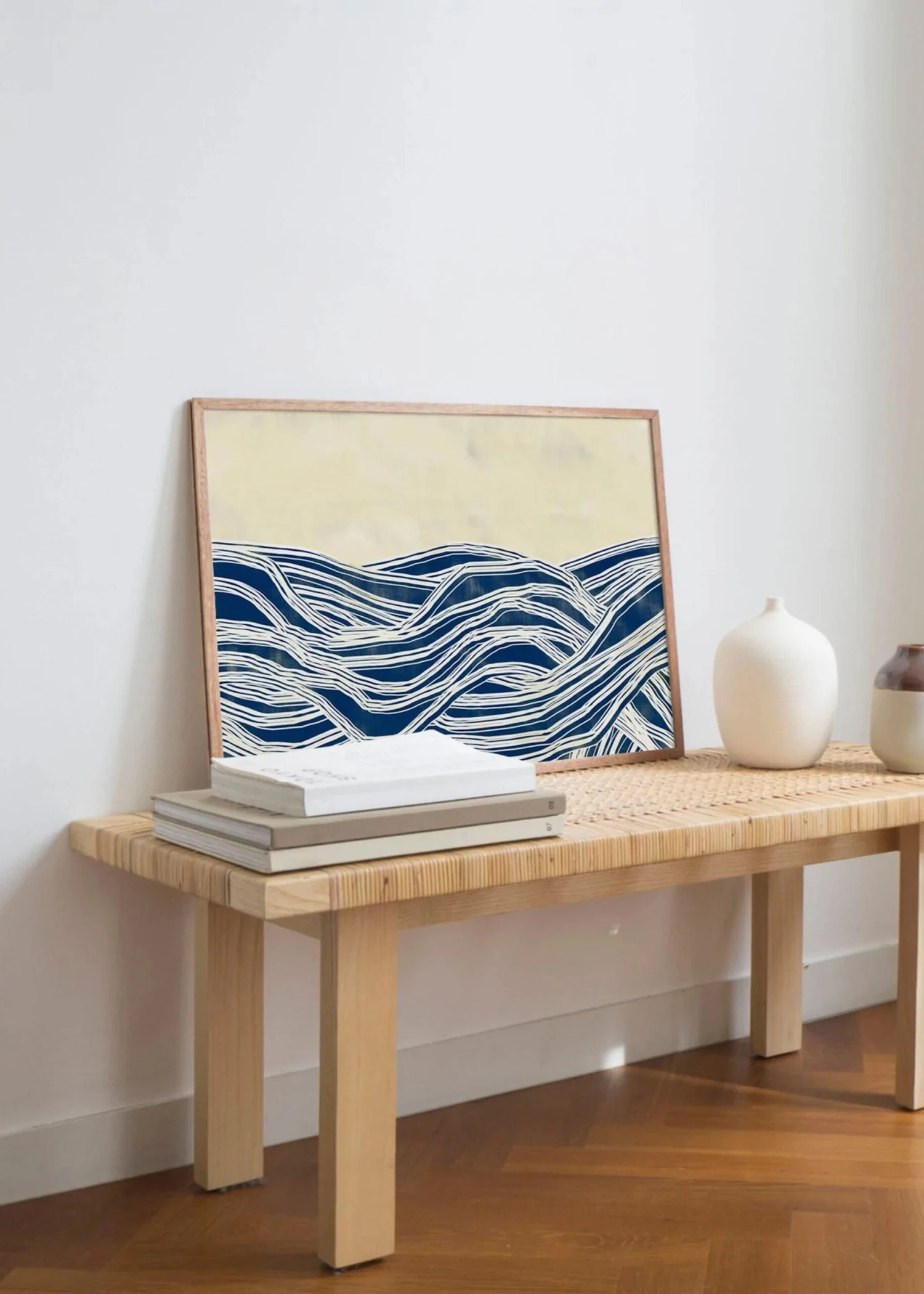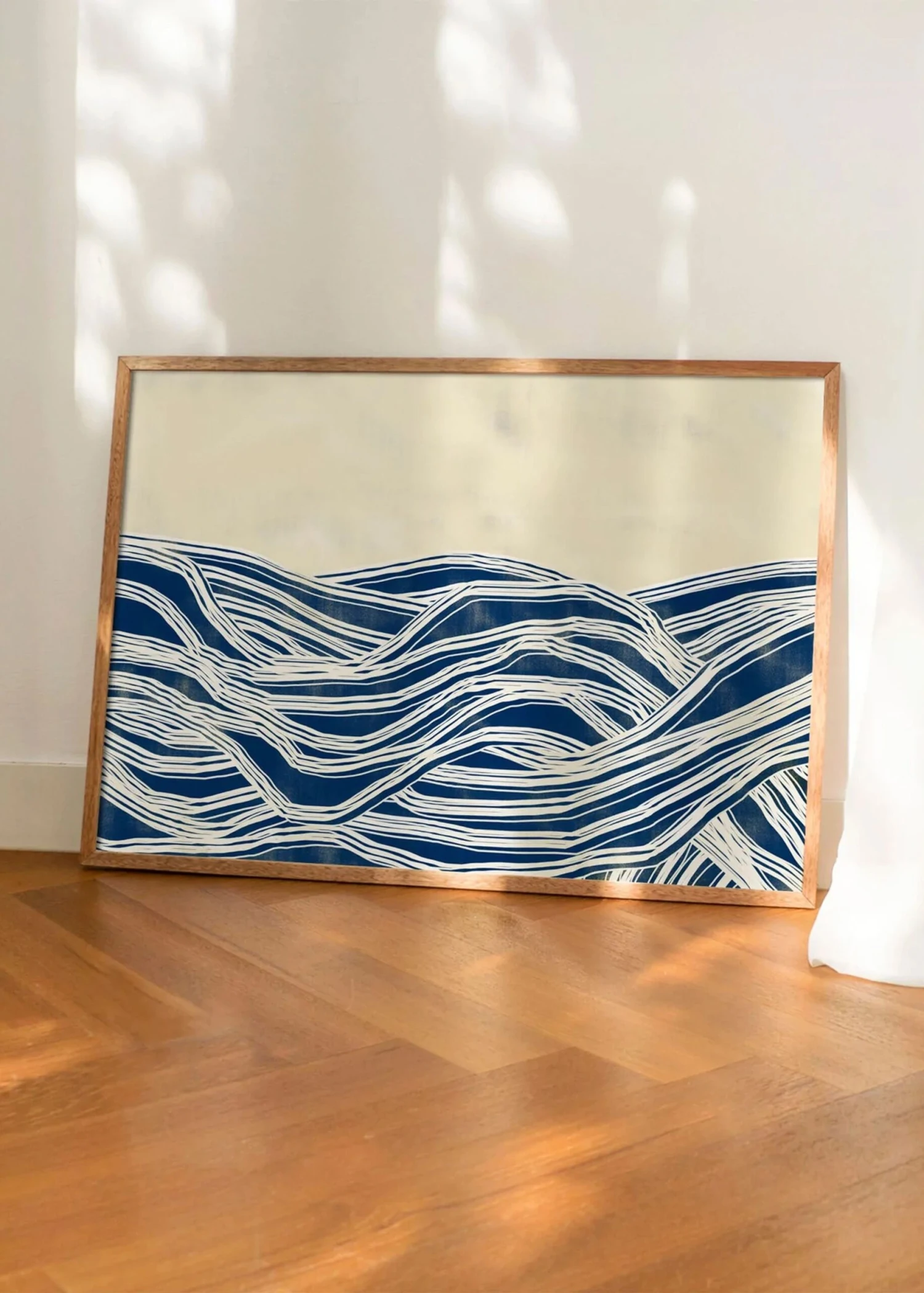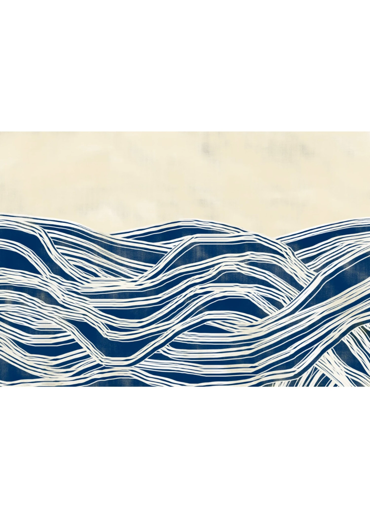 The poster depicts in an abstract artwork, the waves of the sea, with large white lines like sea foam and a deep blue color, to give contrast. Maison Charlot's artwork is characterised by its ashy textures, which are particularly visible in the background of the image. The beautiful cream colour and dark shadows add a new kind of dimension to the image.