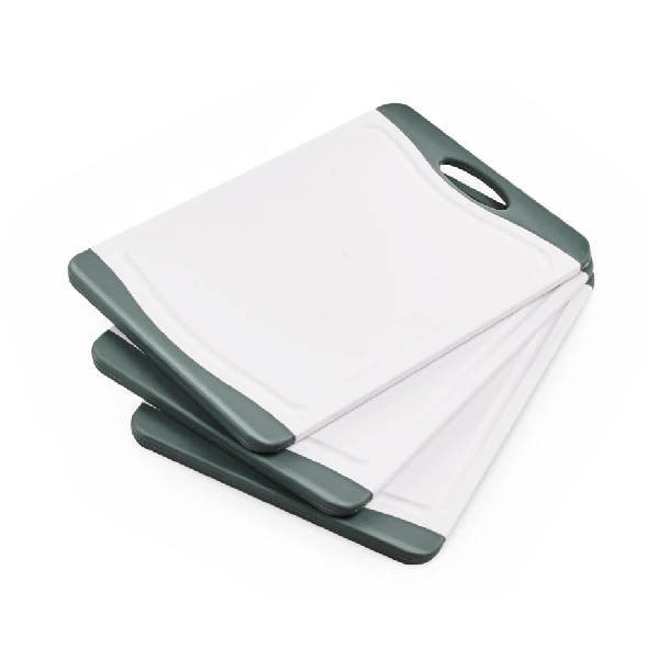 Skærebræt sæt med 3 plastik skærebrætter. Skærebrættene har grå skridsikre silikone kanter, så de bliver liggende på bordet.
