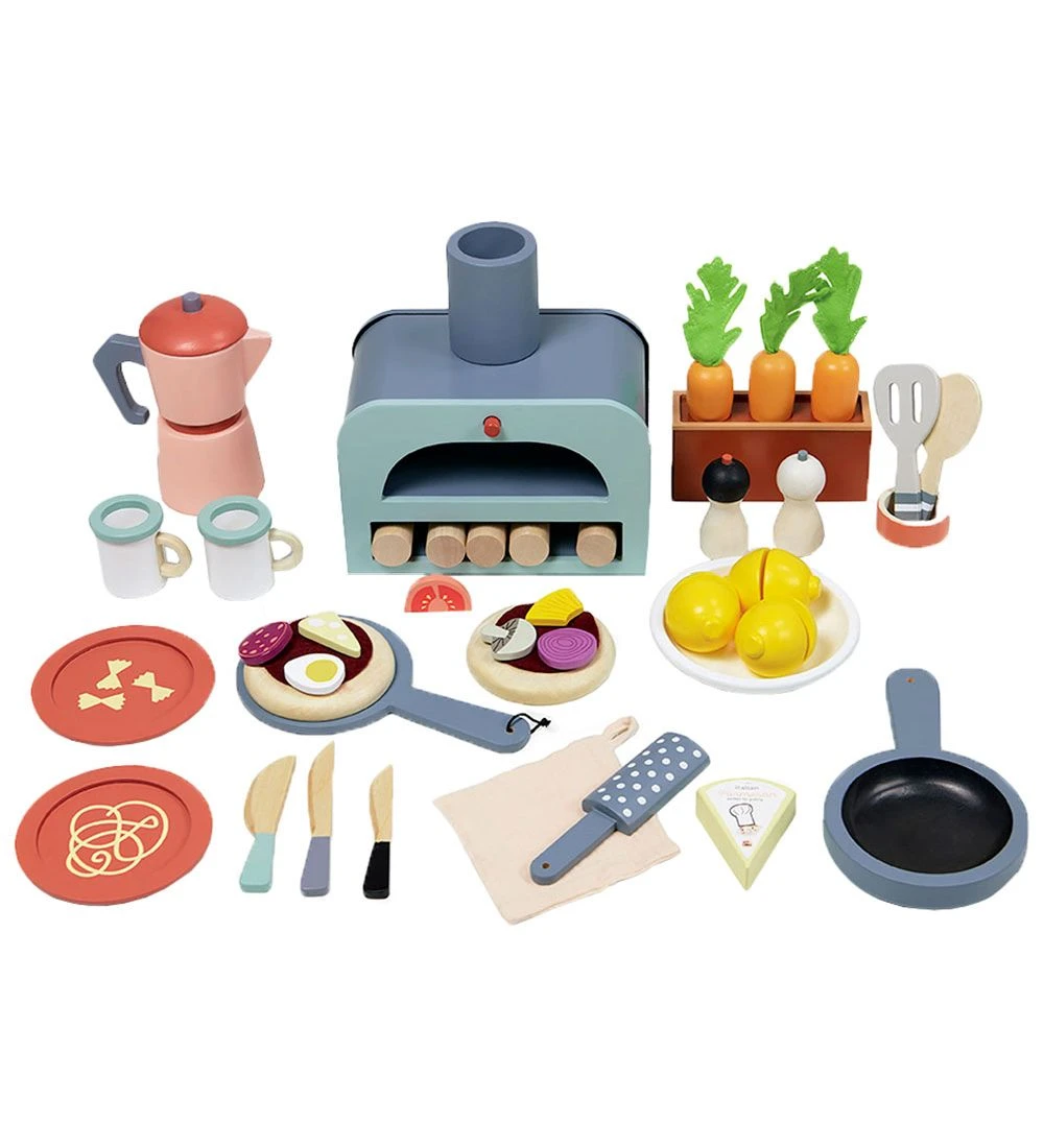 Skønt Tender Leaf legekøkken i naturligt træ, mint, blå og navy.