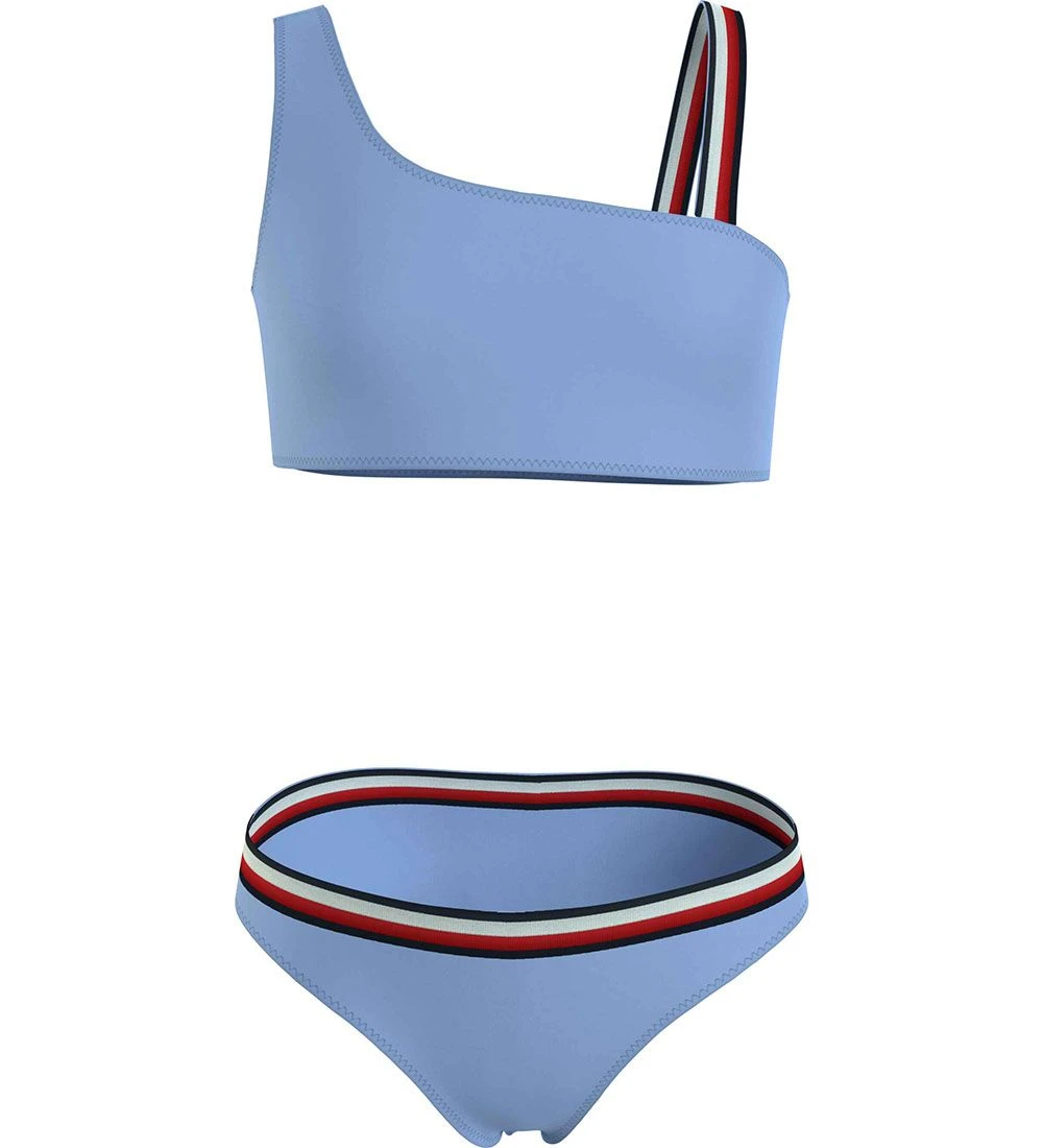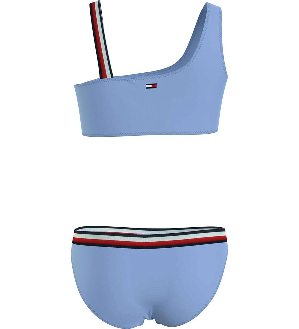 Smart Tommy Hilfiger bikini i støvet lyseblå med et logoprint på bagsiden af overdelen og med stribede detaljer i navy, hvid og rød.