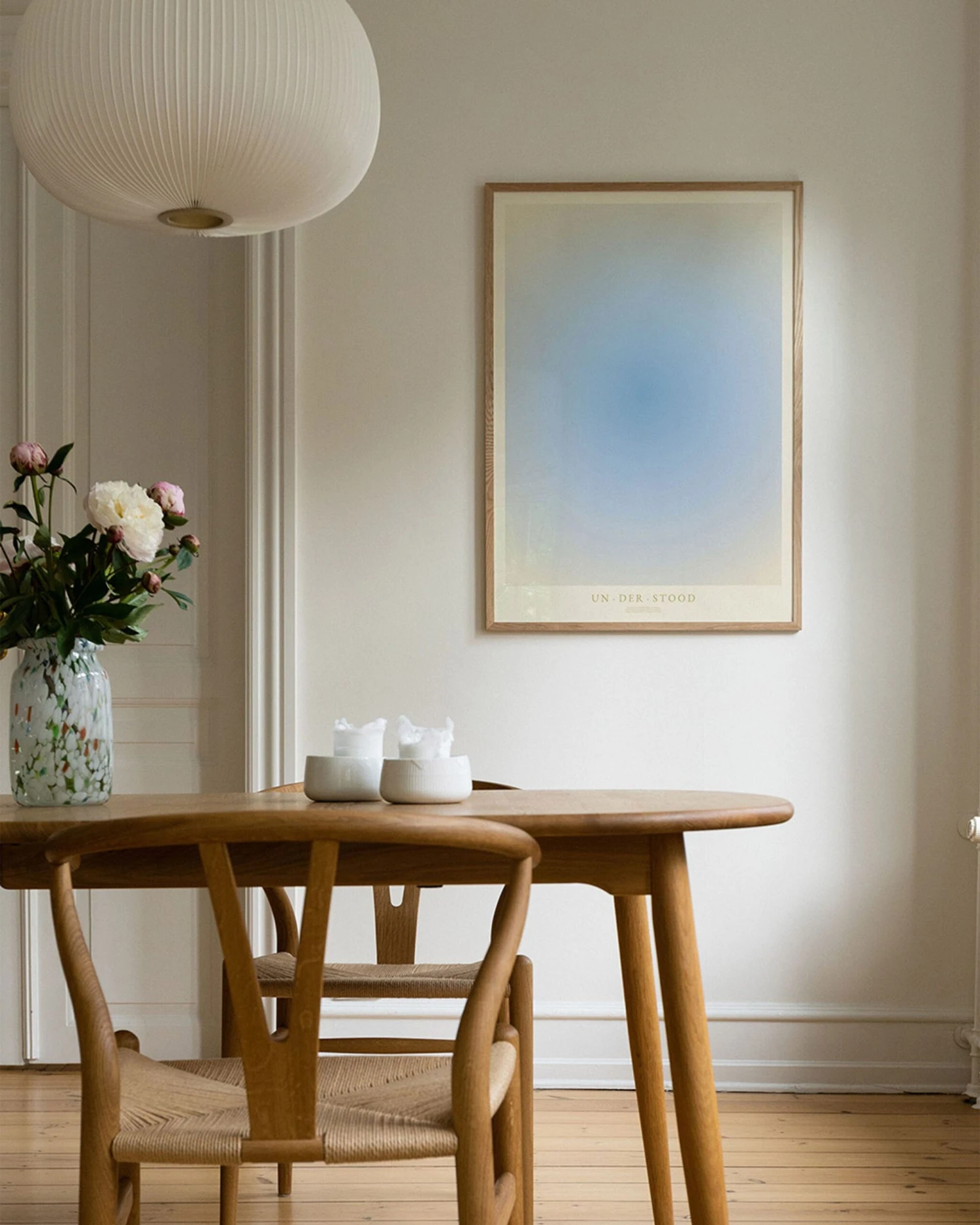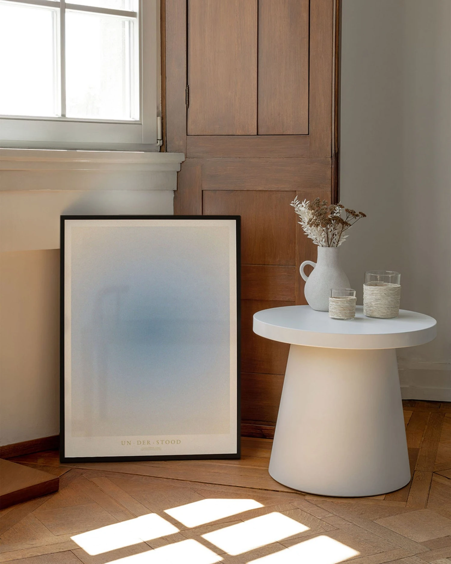 The poster is a graphically illustrated design that does not focus on a motif, but instead a feeling and an impression. Colours are known for their emotional connections. The colour blue symbolises wisdom and understanding – a calm colour with a quiet presence. The simplicity and unique colours give the poster a modern and minimalist look. Therefore, its minimalist design complements any interior design style.